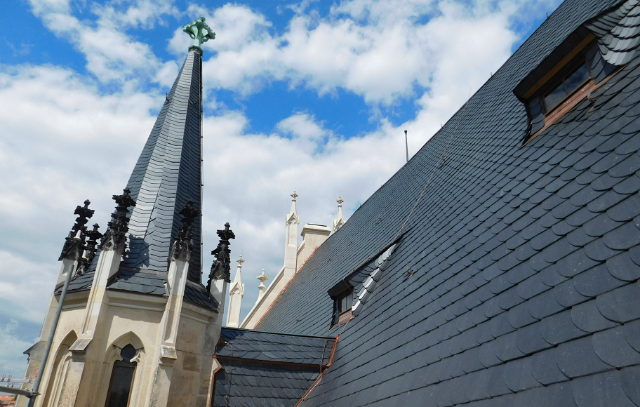Unterschiedlich hohe und breite Decksteine verleihen jedem Dach eine individuelle und lebendige Struktur. Entscheidend ist dabei eine stufenlose Verjüngung der Gebindehöhen von der Traufe bis zum First sowie eine harmonische Verteilung von breiten und schmalen Steinen – so entsteht das charakteristische, handwerkliche Gesamtbild der altdeutschen Deckung.