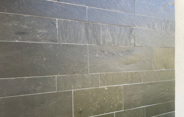 Schiefer-Riemchen bieten darüber hinaus ein hohes Maß an gestalterischer Freiheit. Da sie aus einzelnen Natursteinen bestehen, gibt es kein fest definiertes Verlegeschema. Länge, Breite und Spaltstärke lassen sich individuell kombinieren, wodurch sich der räumliche 3D-Effekt gezielt variieren lässt – von dezent bis ausdrucksstark. So entstehen einzigartige Wandflächen mit natürlichem Charakter, die sich harmonisch in unterschiedliche Architektur- und Gestaltungskonzepte einfügen.